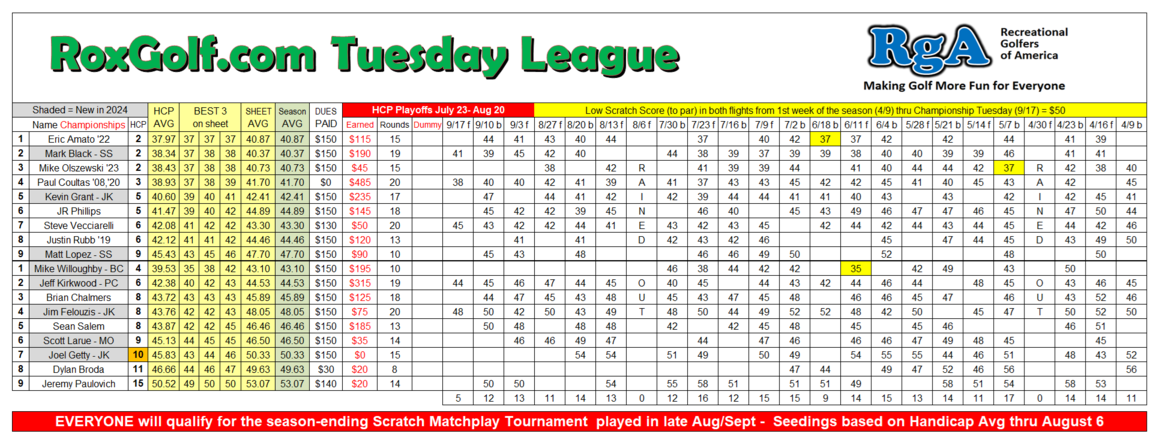 The HCP AVERAGES that are listed are based on 4 values. It is your 3 BEST scores on the sheet over the past 21 weeks AND your overall Sheet Average. Players with less than 10 rounds played will have their average based on their BEST 3 scores, 1 DUMMY score, and their overall average. Once you record 10 scores, your DUMMY score will disappear.